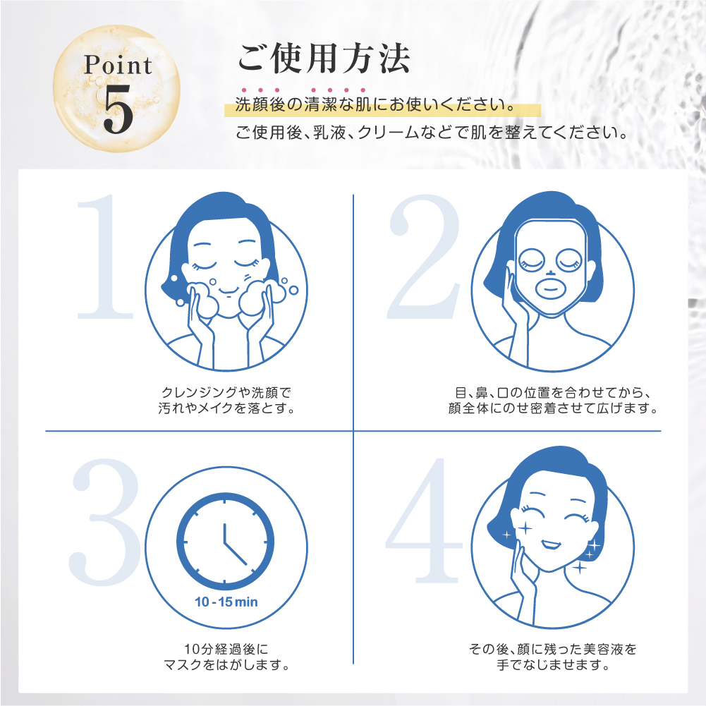1.ご使用中に腫れやかゆみ、刺激などお肌に異常が現れた場合は、使用を中止し、皮膚科専門医へご相談下さい。 2.傷や湿疹、皮膚炎などのある部分には使用しないで下さい。 3.保管及び取扱い上の注意事項 ・開封後はお早めにご使用下さい。 ・衛生上、一度使用したパックは再度使用しないで下さい。 ・目の周りを避けてご使用ください。目に入った場合は直ちに水またはぬるま湯で洗い流して下さい。 ・幼児やお子様の手の届かない場所に保管して下さい。 ・直射日光のあたる場所や極端に高温・低温になる場所には置かないで下さい。